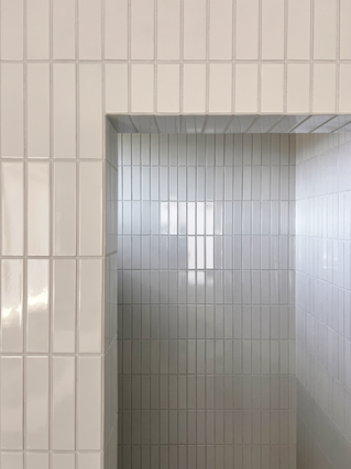 The main bath is a quiet sanctuary; hand-made vertical tiles and brass accessories provide a rich, pillowy feel for her daily bathing rituals.