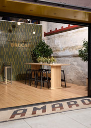 On a busy street in SF, Brucato Amaro Distillery and Restaurant was inspired by the vibrant history and diverse agriculture of California and the Italian heritage of amaro. The restaurant, bar and distillery are made of many moments including a rootbeer colored tiled plinth in the dining room. The tasting room exudes a Nor-Cali Italian vibe through hues of greens, chartreuse, rootbeer and pinky oranges (check out the woo in the loo!) that complement the bounty and creativity of California ingredients.
