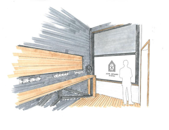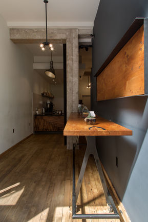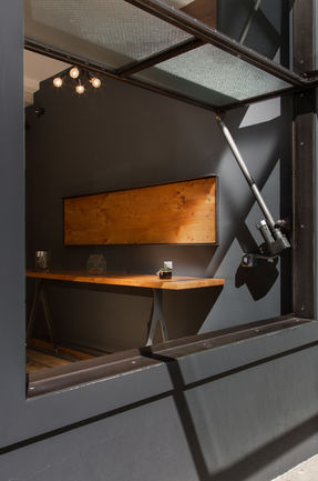 Finding ingenious ways to maximize the limited space and foster community was top priority. We designed a hydraulically operated pivot window to open the storefront, creating a covered sidewalk area that extends the cafƩ outside. From inside, a large, counter height wood table on casters rolls partially out the opening to serve guests on both sides.