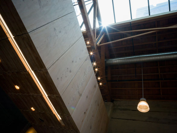 Oakland Commons is designed as an intimate hub that can foster endless opportunities. As soon as guests walk through the fourteen-foot-high, mid-century bronze Nanawall sliding glass door system, one of the tallest commercial applications in the Bay Area, they are met with the โproscenium,โ one of the main inspirations and central focus for COMMONS and a key aspect of Bintaโs vision. Inspired by a recent visit to Copenhagen and built of intricate wood details by Roman Hunt, the prosceniumโs deodar cedar is planed and milled to accentuate all three grain surfaces โ end grain, face grain and edge grain โ and provides a canopy for the feature cafรฉ/bar below.